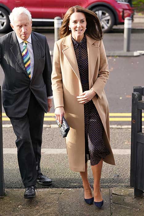 Kate looked gorgeous in a chic navy polka dot dress from highstreet favourite, L.K.Bennett. The sophisticated dress featured yellow dots in a sublte nod to the Ukrainian flag. She layered with a sleek camel coat and opted for a pair of suede court shoes.