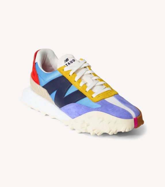 The New Balance x Staud trainers feature a fun surfer-inspired colour block design for retro 1980s and 1990s vibes.