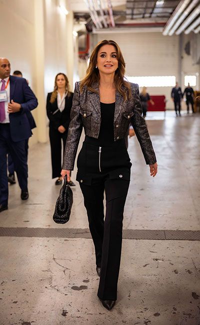 Queen Rania looked seriously cool in Bottega Veneta trousers and an Alessandra Rich cropped jacket