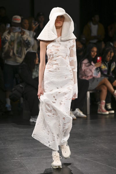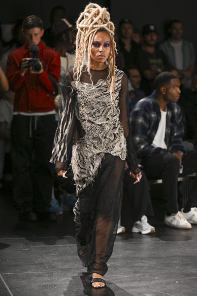 Through purposeful distressing, picturesque embroidery, and meticulously manipulated denim, no look was left feeling flat. Known for their upcycling of denim, the line was no short of eye-catching jeans. Encrusted with tear-dropped gems, overlaid lace, etched ripping, and accented distressed fringe, the collection’s denim was a unique fusion of punk and hip-hop flair for a refreshing take on surface detailing. You see these masterfully articulated in the final look— a logoed accordion denim tiered skirt paired with a black asymmetrical studded lined top. The closing hero look was crafted for Nike inspired by the controversial denim mini skirt Serena Williams wore to the 2004 US Opening.