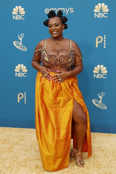 One of the standouts on the mustard yellow carpet was no other than the original Dreamgirl, Sheryl Lee Ralph, in her custom black velvet Brandon Blackwood. This collaboration marked a first for the pair, the first foray into dressmaking from the renowned accessories designer, Blackwood and the first Emmy win for Ralph.”I literally just started crying,” Blackwood tells ESSENCE about seeing Ralph take the stage to receive her award in his design. “She’s Jamaican, and so am I, and my first gown and her first win, so it was just a lot.”